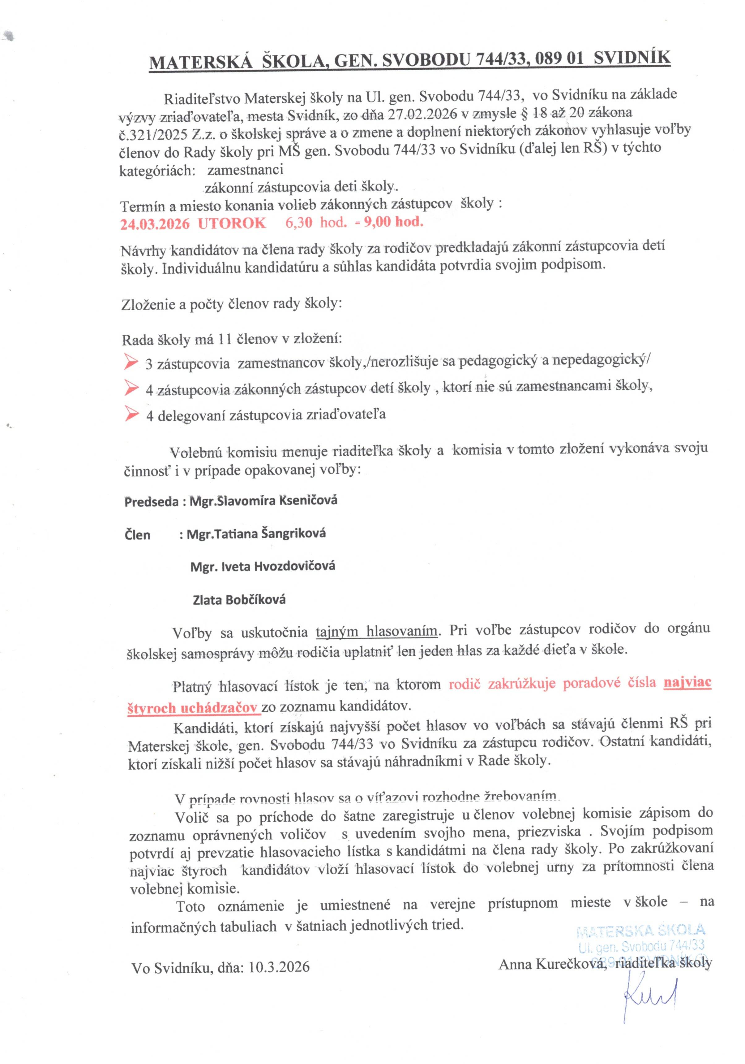 Oznámenie o konaní volieb 24.3.2026.